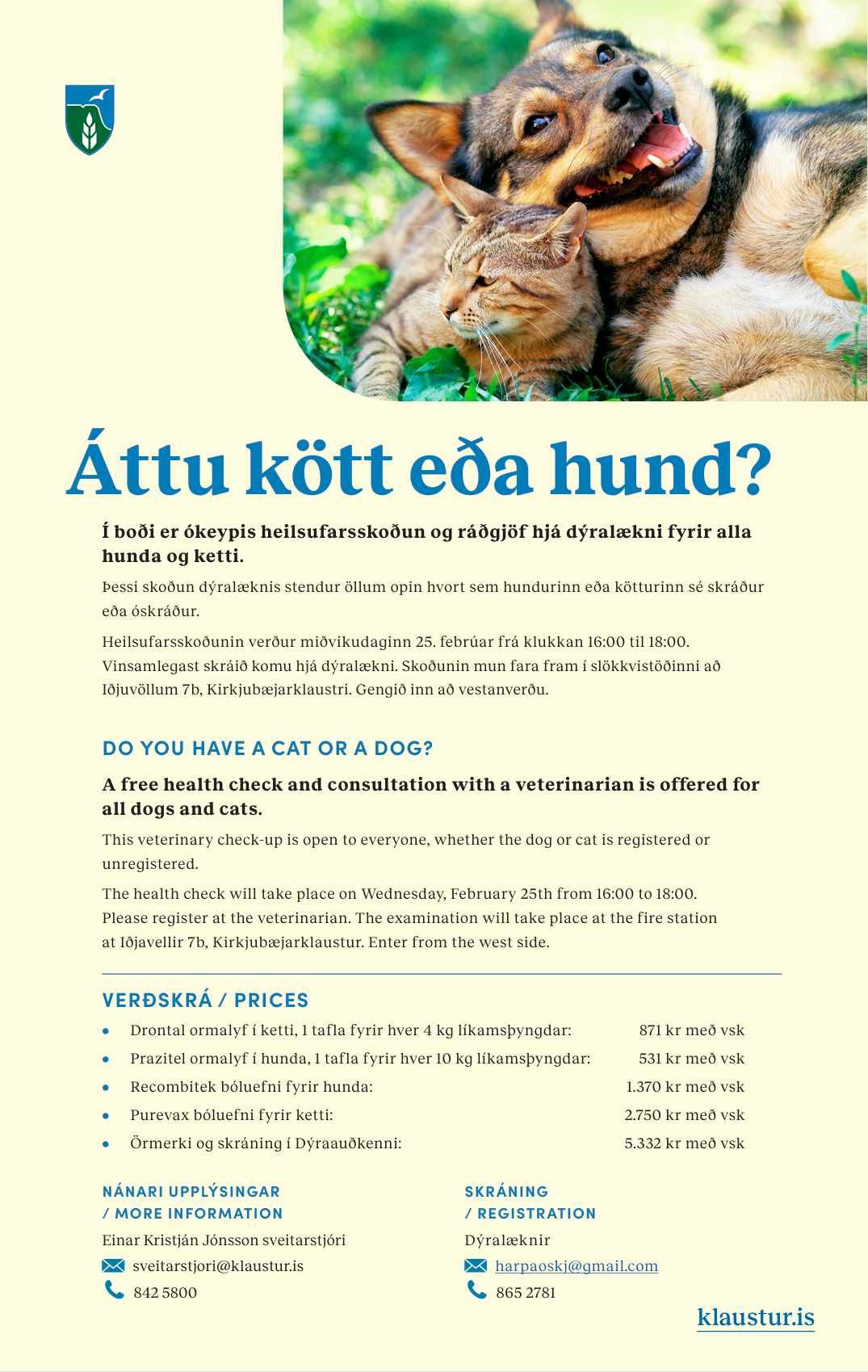 Í boði er ókeypis heilsufarsskoðun og ráðgjöf hjá dýralækni fyrir alla hunda og ketti.