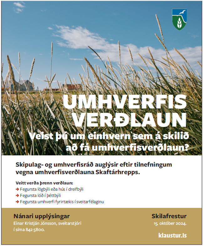 Skipulag- og umhverfisráð auglýsir eftir tilnefningum vegna umhverfisverðlauna Skaftárhrepps.